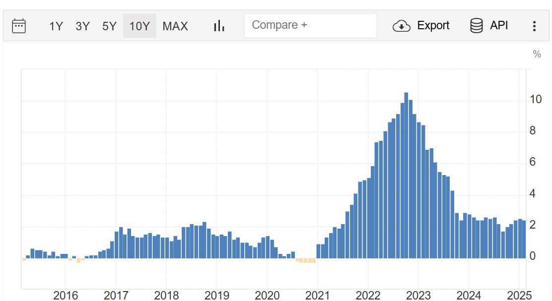 Yukarıdaki grafikte, uzun yıllardır %2'nin altında kontrol altında tutulan bir enflasyonun bazen ise %0 ve hatta negatif seviyelere gerilediğini görebiliriz. Öte yandan, Euro bölgesindeki enflasyonun 2022'de %10'a kadar çıktığını daha sonra ise %2,2 civarına gerilediğini söyleyebiliriz.