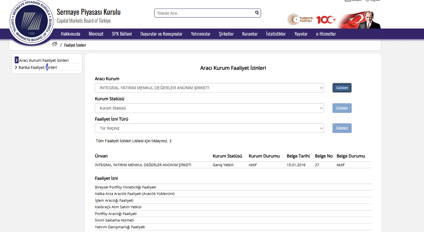 Aracı kurum, 2016 yılında "27" belge numarası ile geniş yetkili aracı kurum statüsüne erişmiştir. Bu kapsamda, İntegral Yatırım Türkiye içerisinde göstereceği finans ve aracılık faaliyetleri konusunda düzenleyici kurumdan gerekli izinleri almıştır. Ayrıca, yatırımcıların platform üzerinden Türkiye’de yaptığı yatırımlar 6362 sayılı Sermaye Piyasası Kanunu ile korunmaktadır.